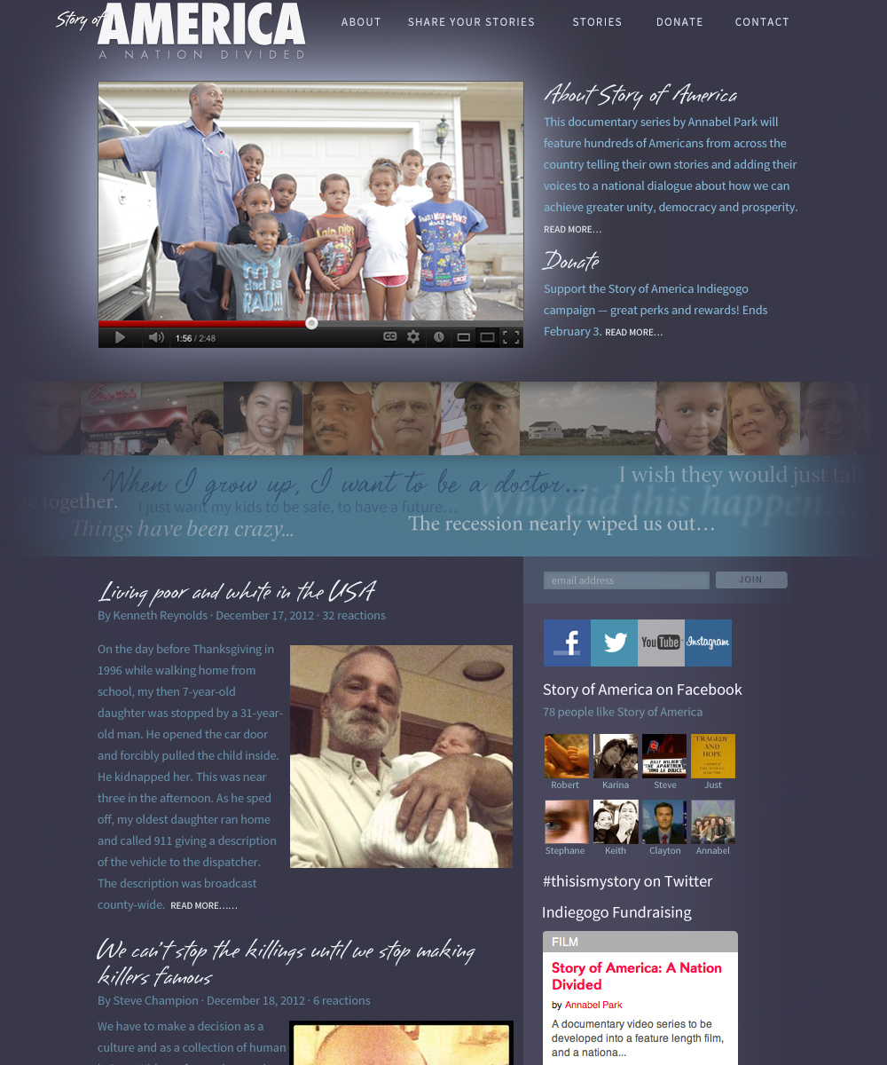 Design and implement a web site for a crowd-sourced documentary film project that aims to nurture the healing of America’s political and social divides by finding common ground in people’s stories. The site is designed to be a repository of shared personal stories as well as video segments produced for the film, with a goal of fostering conversation and ultimately building a community around the shared stories.